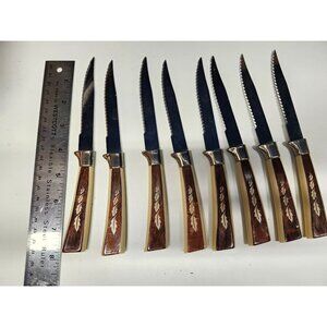 8- Regent Sheffield Bakelite Handle Steak Knives Vintage Set Leaf Cream Brown