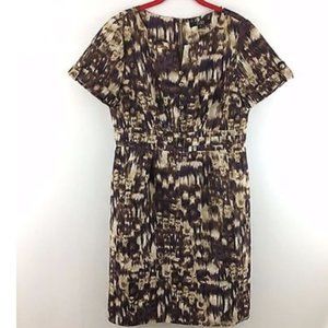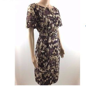Alex Marie Autumn Sunset Ikat Sheath Dress SZ 14, cream, brown, purple watercolor Ikat print, brass button and buckle details, short sleeves, lined, back zip closure, see photo for fabric content, excellent pre-owned like new condition, Measures: shoulder to shoulder 16", armpit to armpit 21", waist 18", length 35.5".
