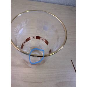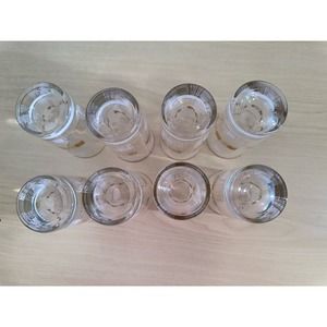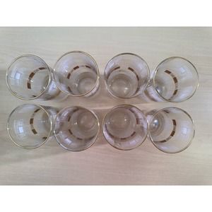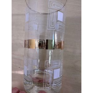 Vintage 1950"s Block Geometric Collins Glasses With Gold Rim. Included 8 glasses with metal carrying caddy. In great vintage condition. The gold blocks have scratches on them that are only visible is you look very closely. I have tried to include them in the pics, as I wanted to be honest. However, they can't be seen very easily. One of the glasses has a factory bubble around the rim. I have circled it in one of the pics. The glass is still functionable. This set won't disappoint you, it is in excellent condition. Please ask for more pics or details.