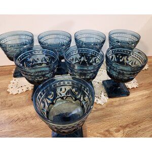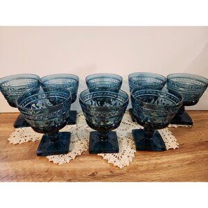 Set of 8 gorgeous vintage blue glass goblets. Champagne coupes or sherbert glasses Park Lane Blue pattern by Colony / Indiana Glass. Slightly under 4.5 inches tall, square foot, detailed stem, beautiful pressed patterned glass from the 1960s-1970s. One has a .5 mm chip to the bottom of the foot, as pictured. The others are in excellent condition with no chips.