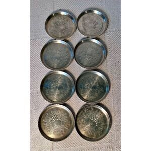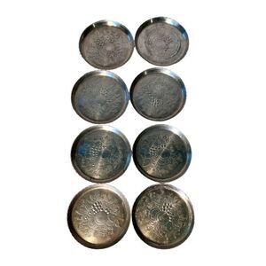 8 Vintage Metal Aluminum Forged Coasters Fruit Flower Pattern Scallop Edge Retro