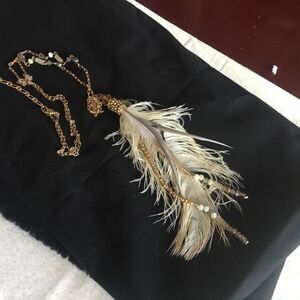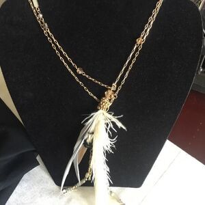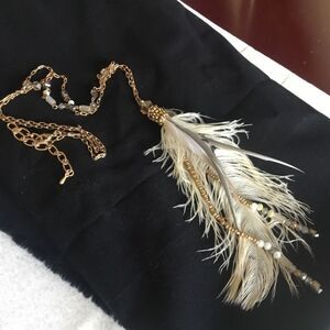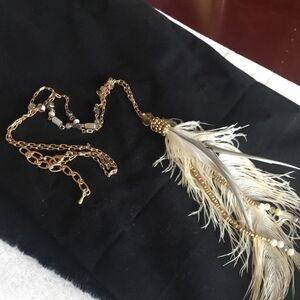 This adjustable goldtone necklace features crystals, seed beads and feathers! It has a length of 28” with the feather and bead drop adding another 6” to the overall length. The adjustable link allows you to add another 3 inches to these lengths. Lobster claw clasp and very gently used as shown in photos, front and back, which are the same.
