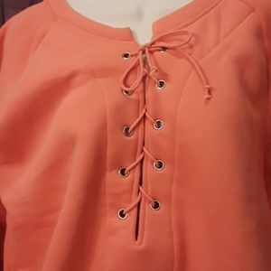Looks orange in picture, but it is pink. Ties in front. The most softest material. Not new but in like new condition. What measures 20 and a quarter inches under the arms, and it measures 23 and a half inches from top to bottom.