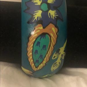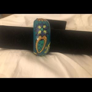 8 inch round handmade bangle, 32 mm wide, dark blue turquoise color background with painted yellow and tan leaves around blue and tan flowers. No markings on it, light wooden material.