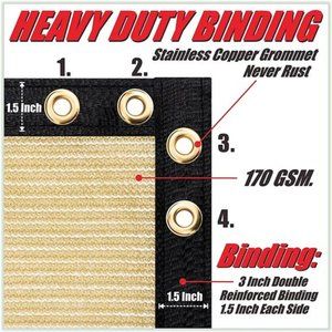 🧿【Comes with the Extra Stainless Grommets and Reinforced Binding】: Grommets are made of stainless copper, each corner has 4 grommets (compares to similar products on the market only have 1-3 grommets), more grommets are placed evenly along all edges, 12 inches apart vertically, 24 inches horizontally. All edges are covered with black reinforced 3-inch binding (1.5-inch on each side). The grommets and bindings help the screen to hold up in the wind.