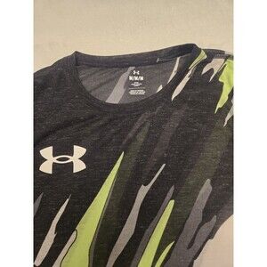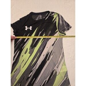 The $80 NWT Under Armour Women's Running Fitted Shirt in size Medium features a green color with a black logo, making it a stylish and functional addition to any activewear collection. This lightweight polyester shirt is designed for summer, fall, and spring seasons, with a slim fit and crew neck for a comfortable and flattering look. The pullover closure and short sleeves make it easy to wear for activities such as gym training, cross training, or jogging, while the Under Armour HeatGear technology ensures high performance and durability. Machine washable and with a chest size of 34 inches, this shirt is a practical and fashionable choice for active women.