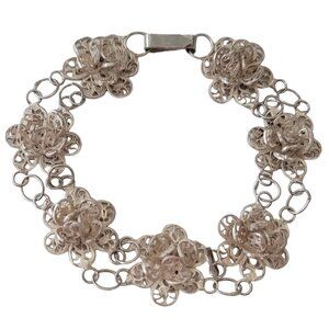 800 Spun Silver Flower Link Chain Bracelet, 8" Long E686