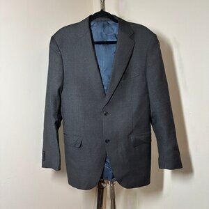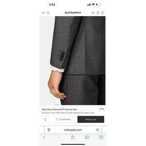 The product is a stylish Suitsupply 2-piece suit in a classic charcoal gray color, made from high-quality pure super 110's wool from Vitale Barberis Canonico Italy. This tailored fit suit features a single-breasted jacket with a notch lapel and double-vented back, ideal for formal occasions like weddings or business events. The suit has a regular fit, flat front pants with a straight leg design, and a chest size of 40 inches. The jacket has a four-button sleeve button style and a two-button front closure. This sophisticated suit is perfect for all seasons and embodies timeless elegance in a modern style.