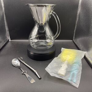 NEW with tags glass coffee carafe and filter set is wrapped and ready for gift giving...it also comes with cleaning wand, and 2 specialized spoons for free!