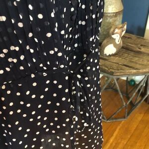 Navy blue with white polka dot patterning; tie waist detailing, pleated bodice.