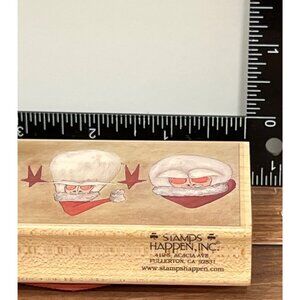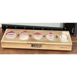 A meticulously crafted wooden rubber stamp featuring whimsical Santa Claus faces with distinctive red hats and star accents, ideal for creating festive holiday cards, scrapbooks, and decorative crafting projects.
