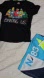 Set of kids graphic t-shirts and shorts. Includes a black t-shirt with colorful graphics, a red and blue long-sleeve shirt, blue and green shorts, and blue shorts with red patterns.