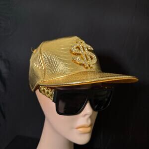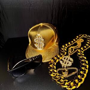 Golden Dollar Sign Necklace/ Ring/ Hat: Cool shiny golden hat in the costumes outfit set have a dollar symbol on them, and the signs are studded with faux diamonds. The dollar sign pendant necklaces and ring are made of quality metal that has metal luster, highly resistant to rust and corrosive buildups, not easy to fade and to get rusty. High polish surface of jewelry set, comfortable for you to wear, lightweight and smooth