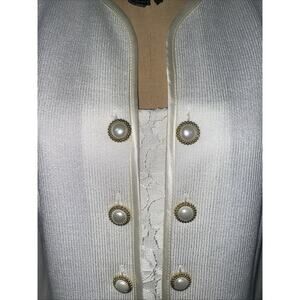 Very clean. No signs of wear. No flaws to note. Acrylic polyester nylon blend (66/22/12). Long sleeves. Knit. Medium weight shoulder pads. Gold ivory button down each side of the bodice. Lace inset (removable if desired). Satin trim around the edges.