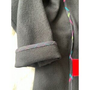 Gorgeous collared button front, fully lined wool jacket. Geometric print/plaid piping on lapel, collar and cuffs.