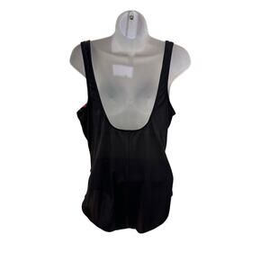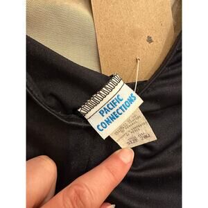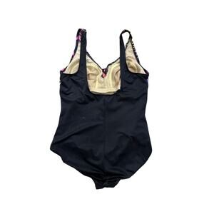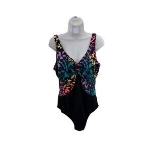Look like you stepped off a Lisa Frank sticker page with this vintage plus size one-piece swimsuit! From either the late 80s or early 90s, this suit is solid black with a top of neon rainbow tropical palm leaf pattern. Has a built in bra and is a nylon/spandex mix. Brand is Pacific Connections and it's sized a 20W. Probably fits more like a modern 18 based on the waist measurements, please see below.