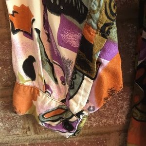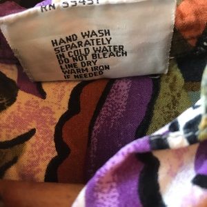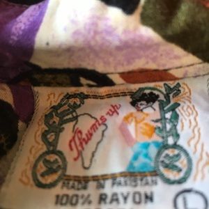 Vintage and interesting 100% rayon love the tag one chest pocket and buttoned sleeves that I think are 3/4 sleeves size large and measures , chest 22” flat front arm 19 1/2 “ from under arm opening at button looks to be about 7” but can be rolled up length 29” in back