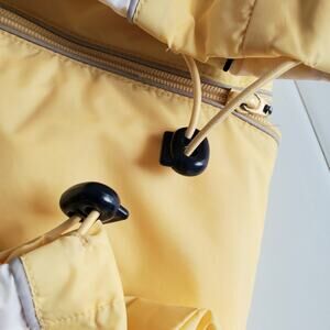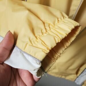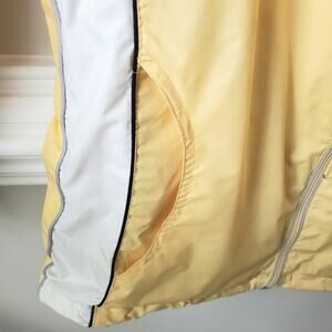 Light butter yellow with contrasting navy blue and white. Full front zip with front slip pockets. Elasticized wrists. Adjustable waist with bungee cord. Fully lined in soft knit.