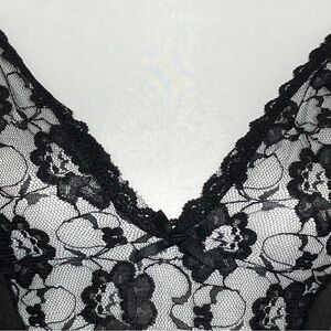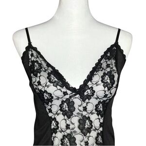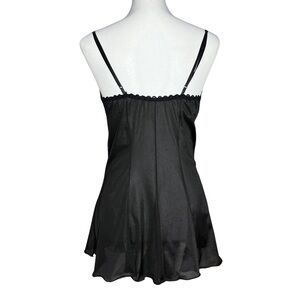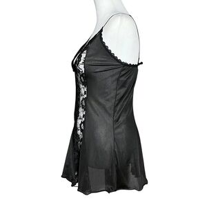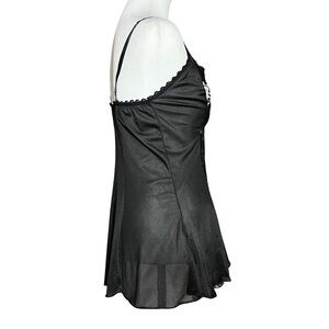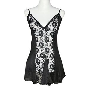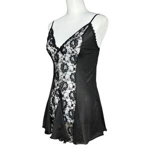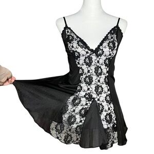 Black satin and sheer lace chemise slip dress designed to mimic a teddy/romper look by Fantasy Lingerie in the 1980s or 90s.