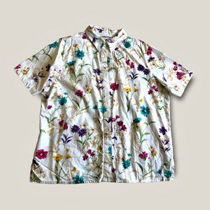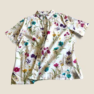 White Shirt with Floral Print, Colors - Blue, Purple, Pink, Green and Cream, Collared Neck, Short Sleeves, 1st Button has Fabric Covering, Remaining Buttons are Invisible, Side Slits. 55% Cotton, 45% Rayon - Very Lightweight and Fresh. Tagged size 18.