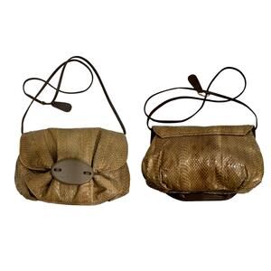 Vintage 80s era tan snakeskin bag. Pouch style with leather shoulder strap and piping, large plastic piece at front. Great style! Lined in leather with one interior zip pocket