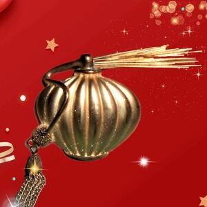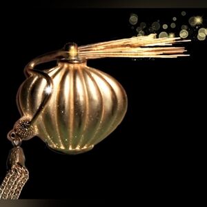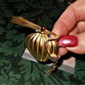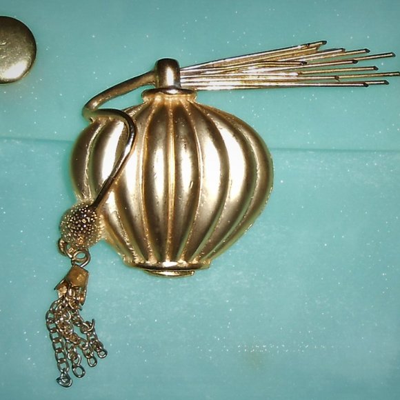 Goldtone perfume atomizer brooch measures 2 1/2" x 2 1/2". Detailed tassel & faux spray. Unsigned.