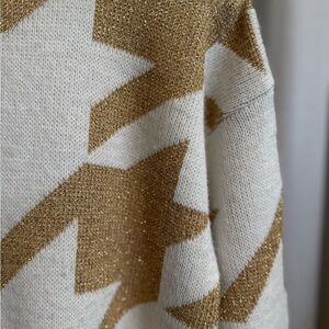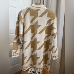 Stylish oversized sweater with a bold tan and cream houndstooth pattern. Made in USA. 90% acrylic, 10% lures. Perfect for cozy days.