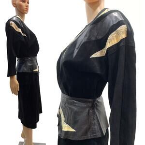 80s era black suede dress with soft leather peplum and snakeskin accents. Buttons at back with zipper on skirt. Lined. Wide batwing sleeves, strong shoulders with large pads.