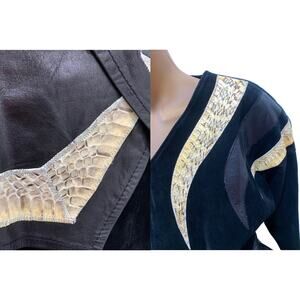 80s Black Suede Leather and Snakeskin Batwing Dress | VTG 10 fits S