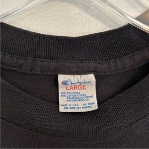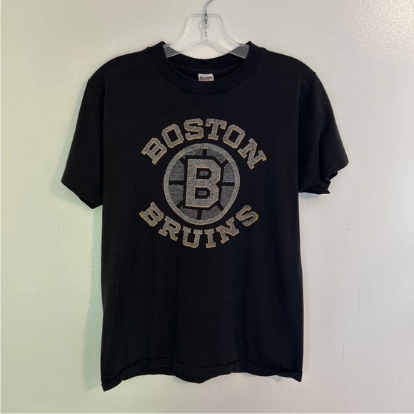 The product is a vintage NHL hockey t-shirt featuring the Boston Bruins from the 80’s. Made by Champion, the shirt is a solid black color with a crew neck and short sleeves. It is a size Large and has a regular fit, lightweight feel, and is made from a blend of polyester and cotton. Perfect for fans of hockey, sports, and the Boston Bruins, this shirt commemorates the team's history in the NHL. Made in the United States, it is a unique addition to any collector's wardrobe. Excellent vintage condition No Flaws. Length is 26”. Pit to pit 18.5” marked as a Large. More of a modern day Medium. Thanks for looking any questions or reasonable offers don’t hesitate.