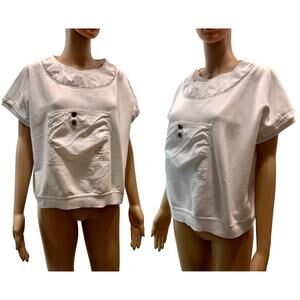 80s oversized, boxy crop top from Chinese Laundry. Cotton, mixed french terry and crisper cotton with logo and button detail on front pocket.
