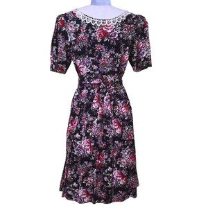 Vintage 80's-90s Dark Floral Secretary Granny Prairie Dress, Brandywine Creek made in Philippines, Style #296-01 marked Ladies size-9/10(M), Scalloped cut-out Lace Collar Sweet V Neckline, fitted Bodice pull-over button front Shirtwaist, gathered Puffy Sleeves with extra padded tulle puffed shoulder pads, Drop waist, below Knee length gathered pleated full circle skirt, attached sash belt, Handwash Cotton/Poly/Rayon blend of crisp lightweight fabric in bright bold shades of Black Pink White. In excellent pre-owned* condition appears new - never worn/never washed -see pics for details. Cottage Prairie, Career Secretary, Victorian Lace, Preppy Academia, Lace Collar, Grandma Chic, Country Western, Farm Church, Special Occasion, Mom Favorite, Easter Garden Tea, Special Occasion, Romantic, Runway On Trend, Street Chic,