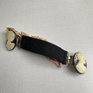 This vintage 1980s jacket cincher features classic ivory cameo molded plastic portraits set against black oval backings, connected by a wide black elastic band and secure metal clips. Originally worn to cinch the back of a blazer or jacket for a tailored fit, this piece also works beautifully as a retro sweater guard or cardigan clip. A fun and functional nod to 80s fashion trends.