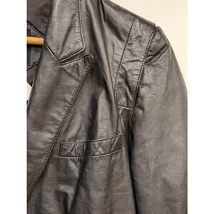 Step into vintage edge with this 1980s Casablanca leather jacket, a bold statement piece that captures the rebellious spirit of the decade. Crafted from genuine leather, it features a structured silhouette with strong shoulders and a button front closure. The rich black tone gives it timeless appeal, while the tailored fit adds a sleek, flattering shape. Whether layered over a band tee or paired with denim, this jacket brings authentic retro cool to any look.