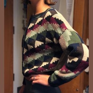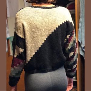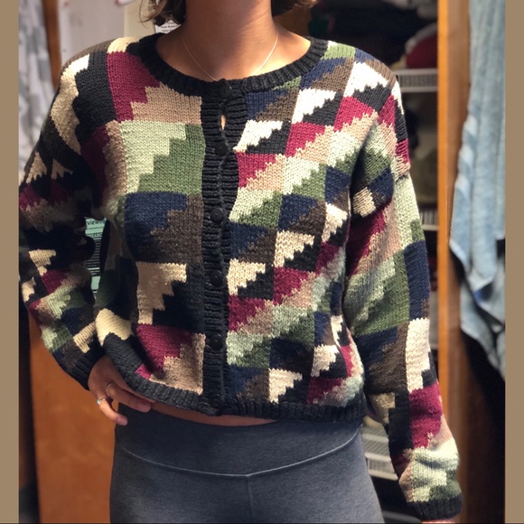#tbt with this crazy button down sweater. Complete with shoulder pads and all, this sweater will be making a statement and turning heads. It’s in great condition and it’s unique geometric pattern is sensational.