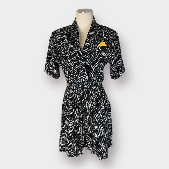80s culotte romper. Black with tiny white polka dots. Wrap front. Two side pockets.
