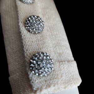 What a classy dress! Vintage 1980's cream hue designer Don Sayres for Wellmore santana knit wool and rayon blend dress. Long sleeves with rhinestone button accented cuffs. There is a very slight drop waist design on the bodice area of the dress. The front bodice has rhinestone "button" accents down the front. They do not "function" as buttons-just for looks. Unlined.