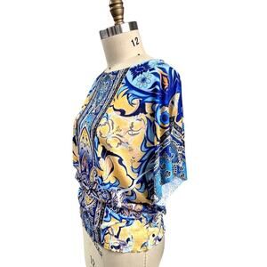 80s Energe world wear 100% Polyester Top Blue/Yellow Wide Waistband Kimono Sleeve Sz L- looks very Italian in colors. Excellent condition.