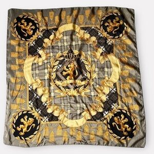 Vintage silk scarf by Express with lions crests in neutral tan brown colors. Hand rolled edges. Has a few tiny jokes. Please see photos. Very busy print, so it doesn’t take away from the scarf.