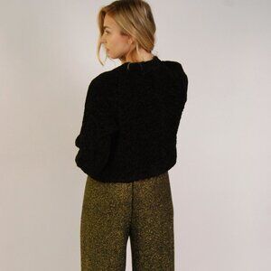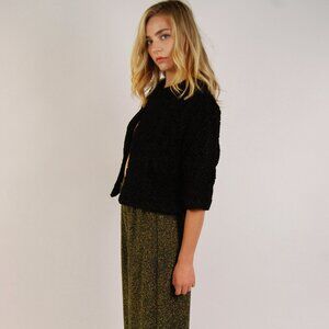 • Fuzzy and fab! Black single breasted button up cropped half sleeve coat with fuzzy swirled textured faux fur. Lined in black satin.