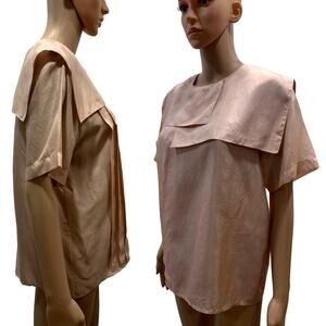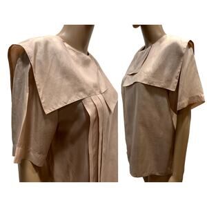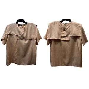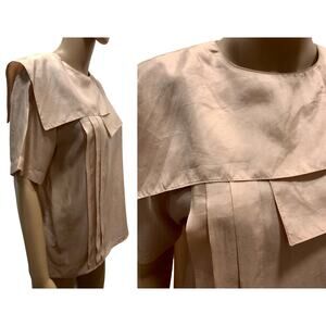 Vintage 80s era silk blouse in pale peachy pink with large asymmetrical cape collar and pleats down right side. Squared off hemline, short sleeves, keyhole and single button at back of neck.