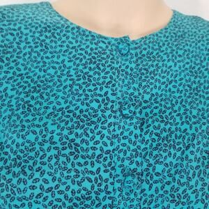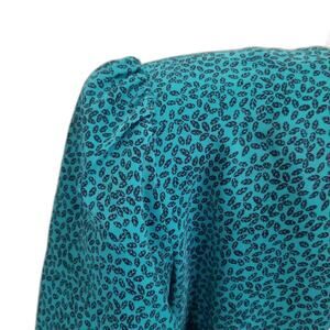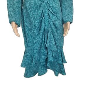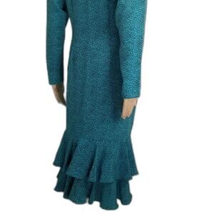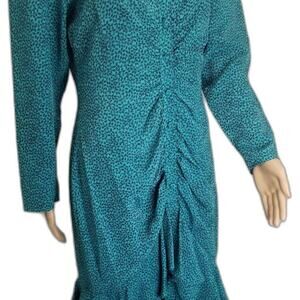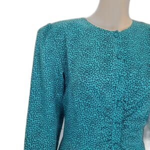 80s Vintage bodycon teal green and black micro feather print long sleeve mermaid dress by Interim. Ruched front from top of stomach to hem of dress. Ruffled hemline has two tiers of fabric. Nine fabric covered button run down front of dress. Puffy long sleeves have shoulder pads with gathered top.