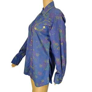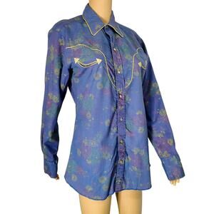 80s H Bar C Purple Floral Metallic Gold Western Pearl Snap Button Shirt SZ 15.5