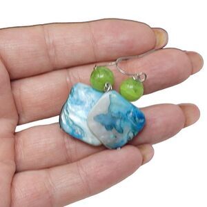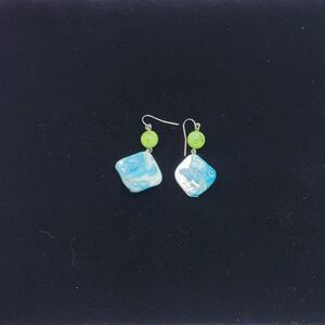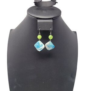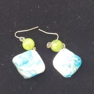 Add a splash of color to your look with these vibrant earrings. The green beads and blue/white marbled stones make these a unique accessory.