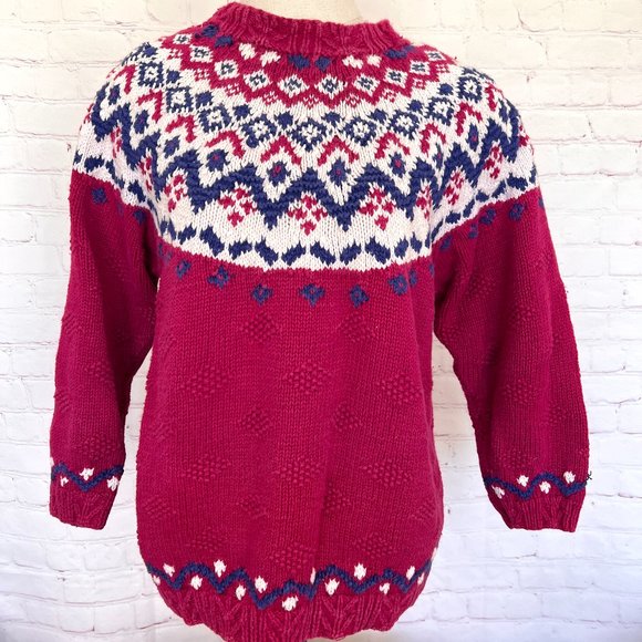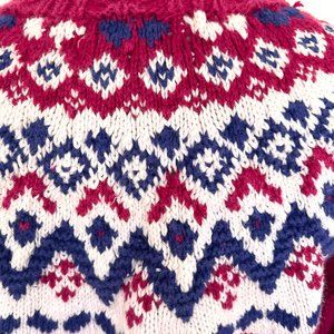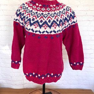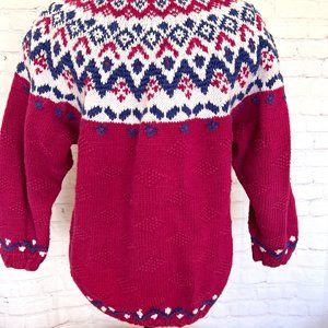 Handknit sweater has a fair isle print in deep pink, purple and white