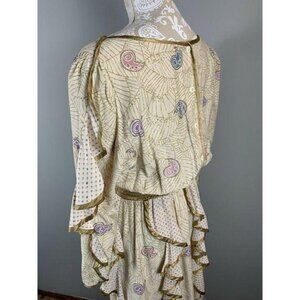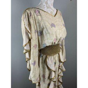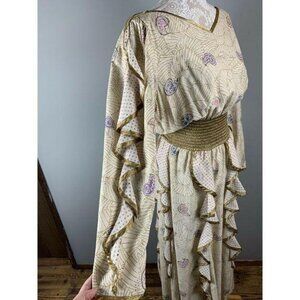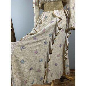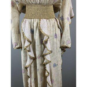 A lovely, flowing, Bohemian dress with a wide gold, shirred waistband, gold trim, and a pale gold fabric with purple and pink dots and paisley with gold cobweb lines. Gypsy, Fairy, Faerie, Elvish, elf, princess,