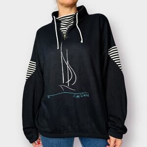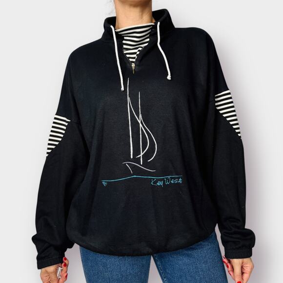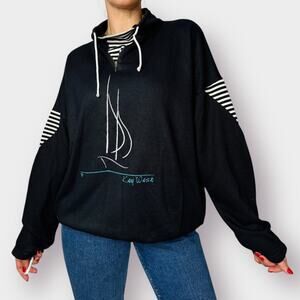 1980s cozy black sweatshirt with black and white striped insets on arms and at neckline. Collar has a drawstring. Elastic on waist and cuff is relaxed.