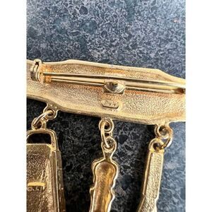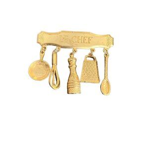 Excellent condition. Jonette Jewelry/J.J. "Le Chef" gold tone brooch with cooking dangles. Hanging from the main "Le Chef" banner are cooking supplies: Frying pan, whisk, pepper grinder, cheese grater, and wooden spoon. The brooch measures 2.5" in length x 2" to the bottom of the longest dangle. The pin stem is approximately 1.25" with a rollover catch. Very good vintage condition. Vintage 1980s.