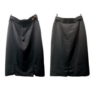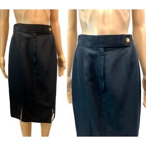 Gorgeous 1980s era black straight/pencil skirt. Lightweight 65% Viscose, 35% Linen blend. Dark black. No pockets, it fits straight with a vented hem (see pics) Fantastic gold sun face button