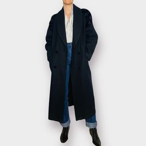 1980s long black coat. Double breasted button front closure. Velvet details at the shoulder.